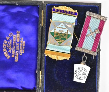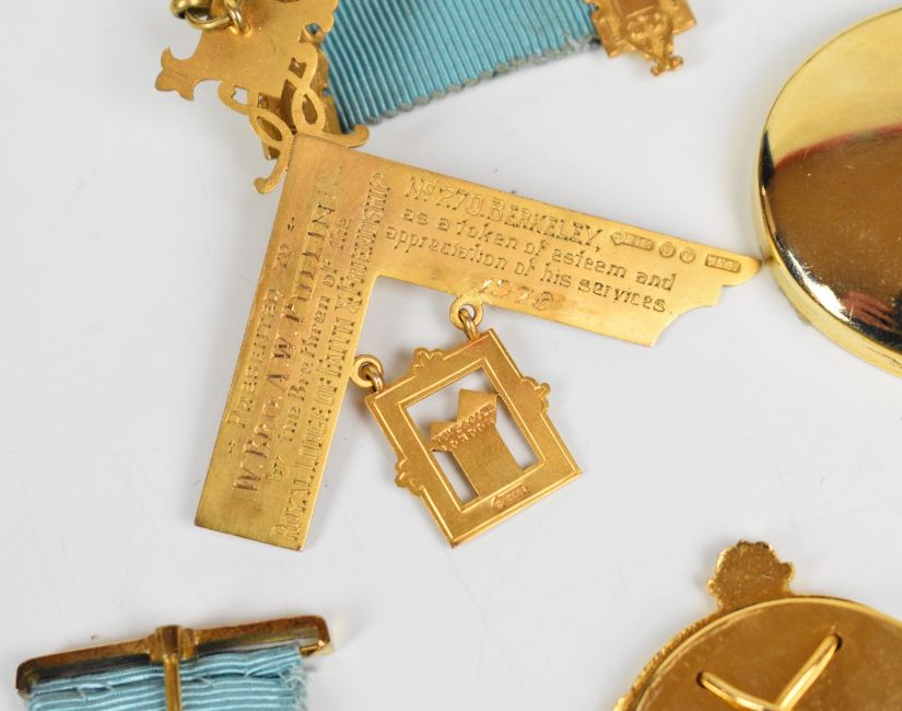 A collection of Masonic jewels, three cased including 9ct gold Toye and Co np 270 Berkeley Lodge, 24.1g all in, two hallmarked silver and enamelled examples, 56.1g all in etc