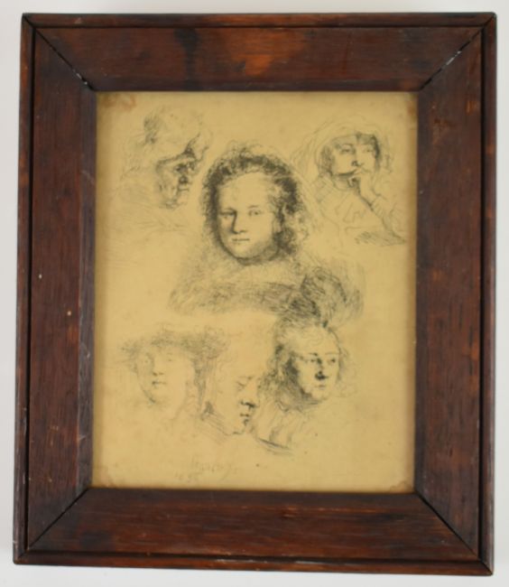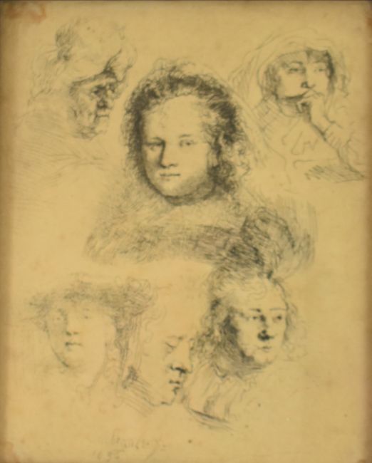 Rembrandt van Rijn (1606-1669) etching Studies of the Head of Saskia and Others 1636, likely later impression of New Hollstein's second state, 16 x 13cm, in oak frame