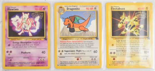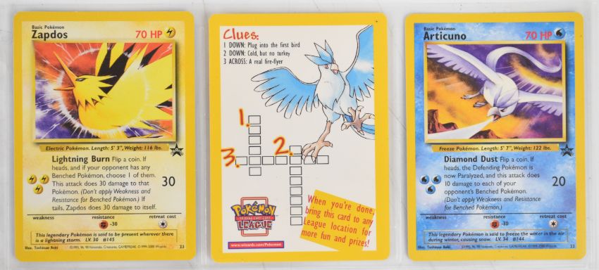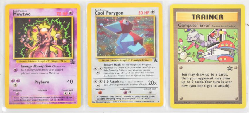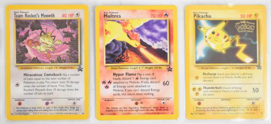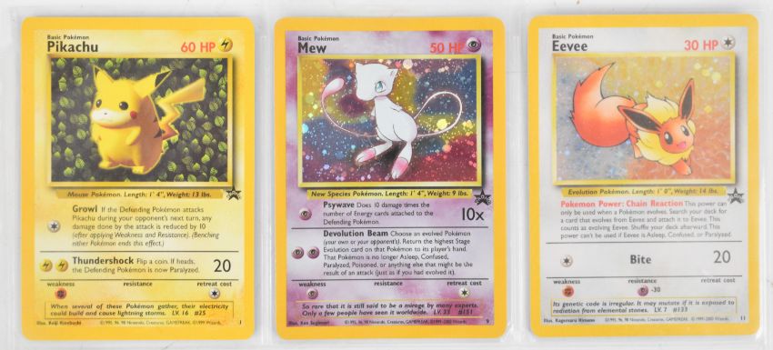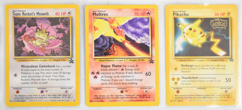 Pokémon TCG - Eighteen Wizards of the Coast era Black Star Promo cards to include Team Rocket's Meowth, Mew, Mewtwo, Eevee, Pikachu, Zapdos, Articuno and a Warner Bros 'The First Movie' 4 card set.