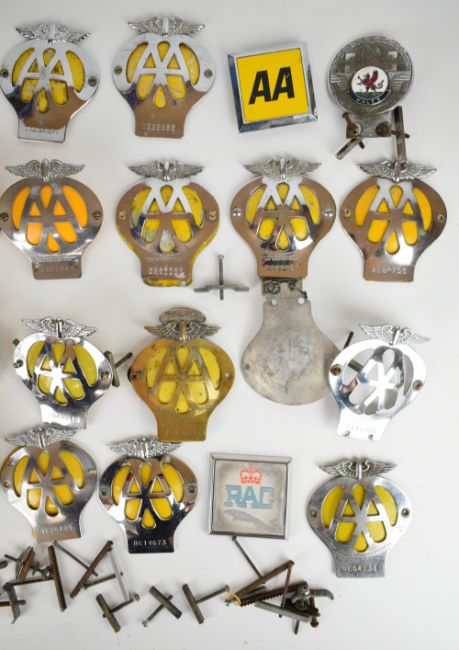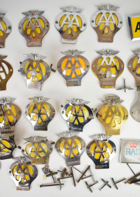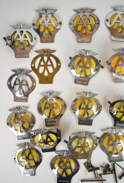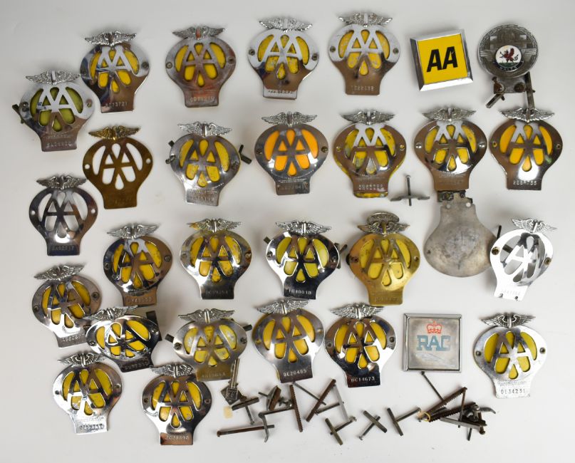 Twenty six AA car badges to include a Malaya example, together with an AA key, RAC badge and a Wales St. Christopher car badge with enamel decoration