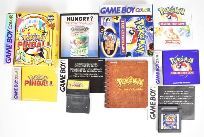 Two Game Boy Color games comprising Pokémon Pinball and Pokémon Trading Card Game, both boxed with manuals.