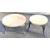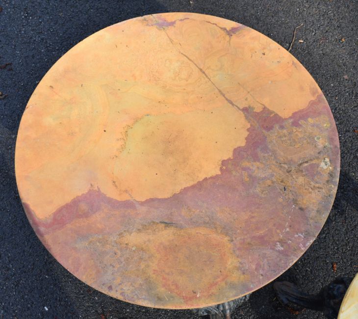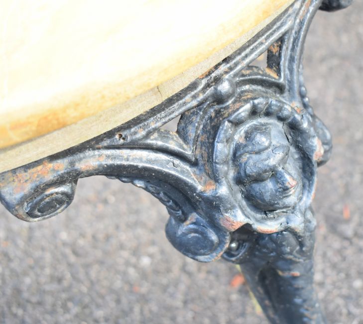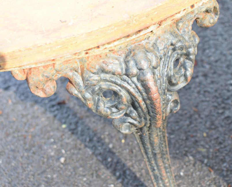 Three marble topped wrought and cast iron garden tables, largest width 84cm