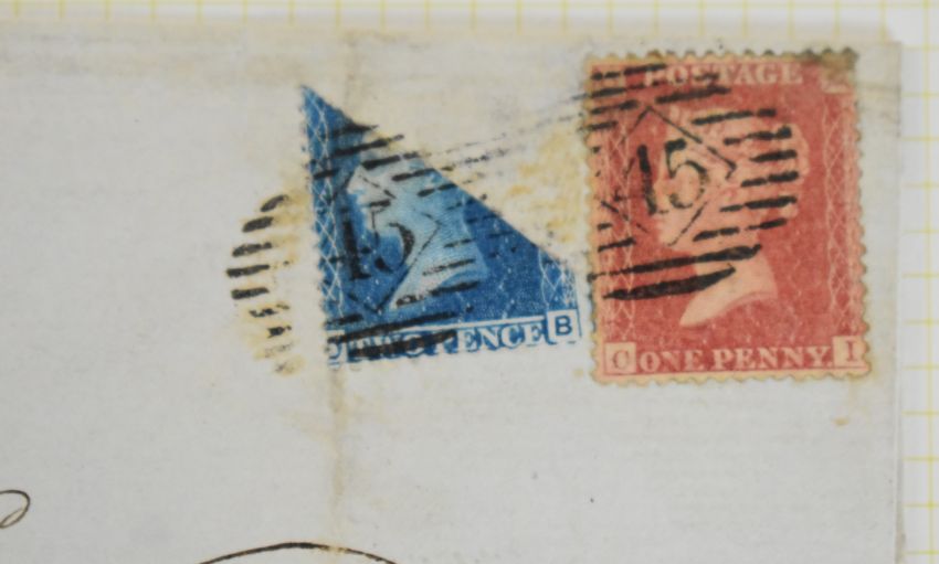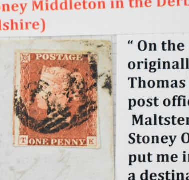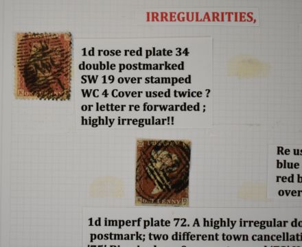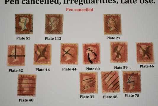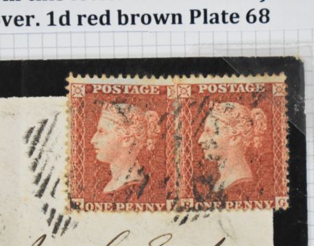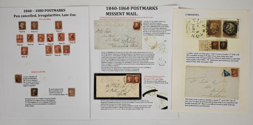 Line engraved selection, well written up, on three album pages includes 1861 cover from London to Halifax with bisected 2d blue with 1d red, piece with two 1d reds, one cancelled with Maltese cross, the other with numeral town cancellation '70', two mis-sent covers and selection of pen cancelled 1d reds