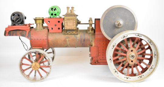 Part built 2 inch scale Thetford Town live steam Burrell showman's road locomotive or engine, comprising copper boiler, wheels, gear train including differential, crankshaft, flywheel, front axle and wheels, cylinder block and two dynamos likely intended for the build, overall length 95cm