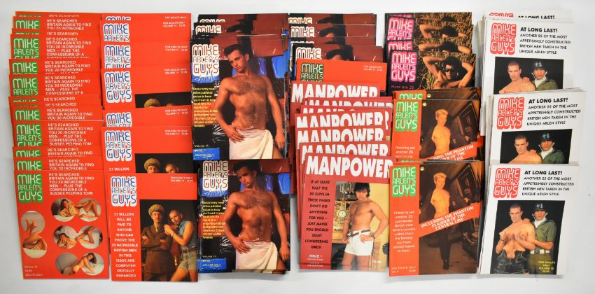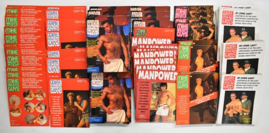 [Adult Entertainment] Collection of Mike Arlen’s Guys, an erotic gay interest vintage glossy magazine (1980s) with colour photographic images comprising four copies of volume 8, eleven copies of volume 9, thirteen copies of volume 12, twenty seven copies of volume 13, thirteen copies of volume 14 and almost fifty copies of volume 11, together with fourteen copies of Manpower adult magazine issue number 1 (130)