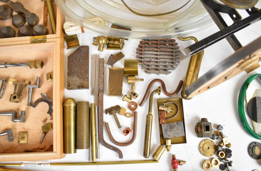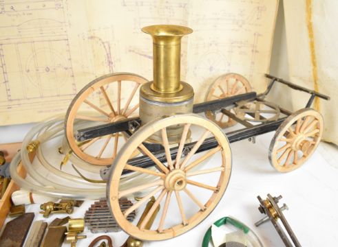 Part built 2 inch scale Shand Mason live steam fire engine, to include chassis, four wheels, boiler casing and funnel parts, engine parts, nozzles, name plates and a set of drawings, length of main chassis 50cm