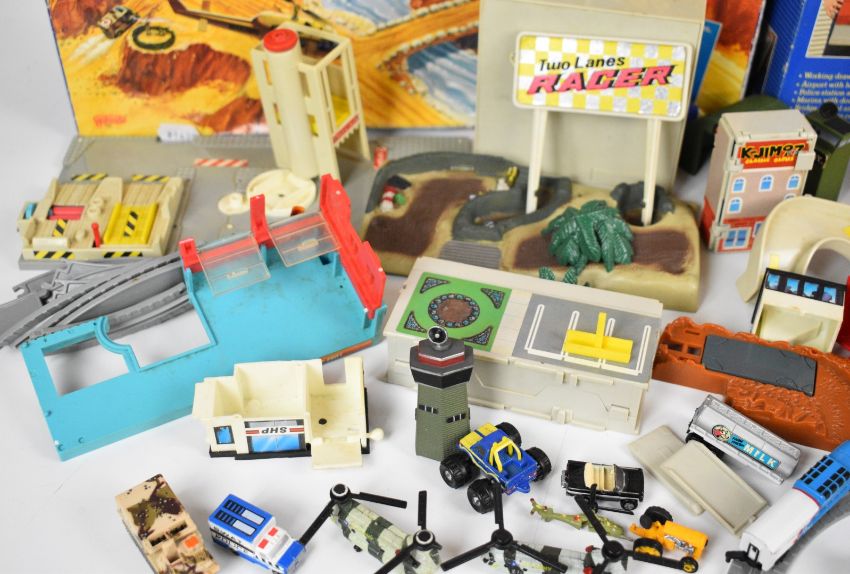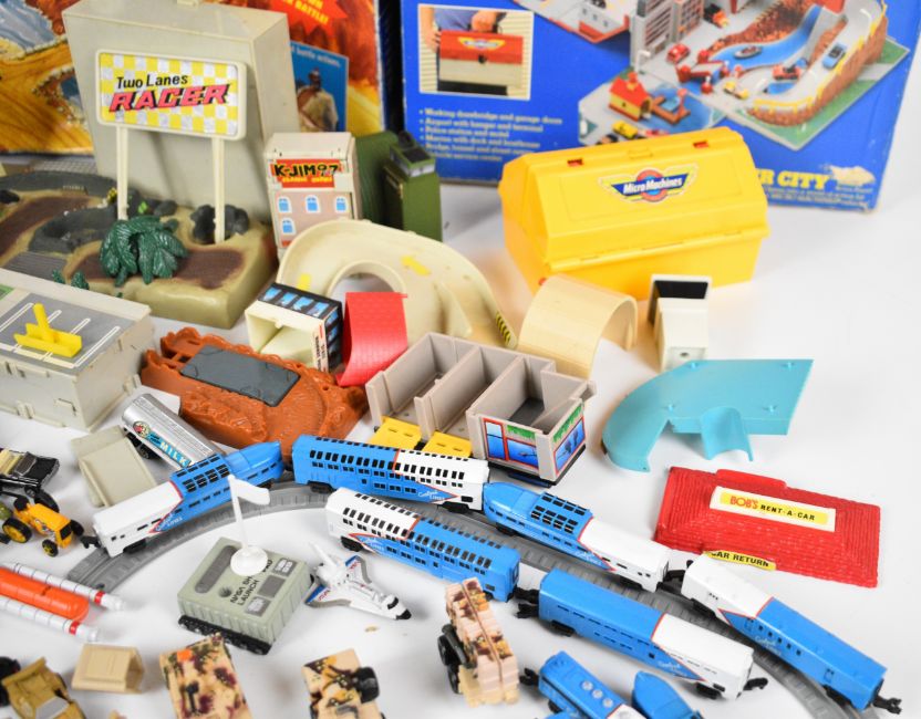 Galoob Micro Machines playsets and vehicles, some in original boxes.