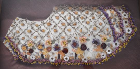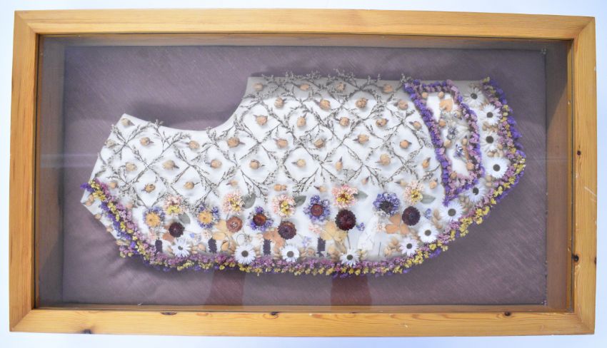 Oshibana style dried flower embroidery artwork of a half waistcoat inspired by Beatrix Potter's Tailor of Gloucester, in glazed case, H95cm