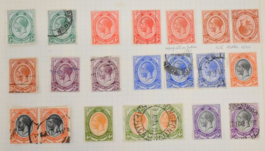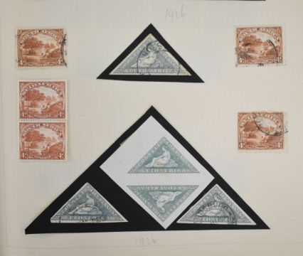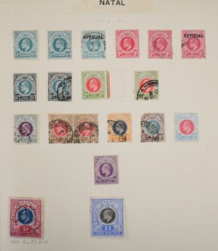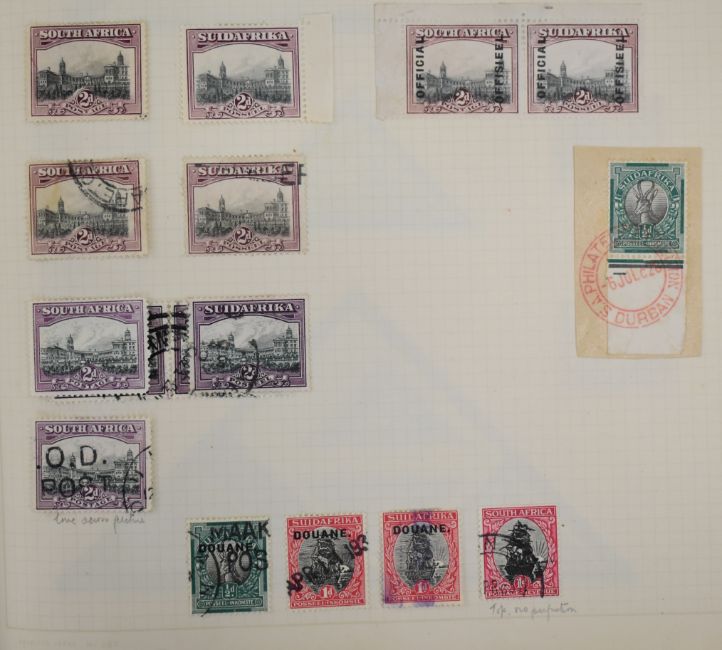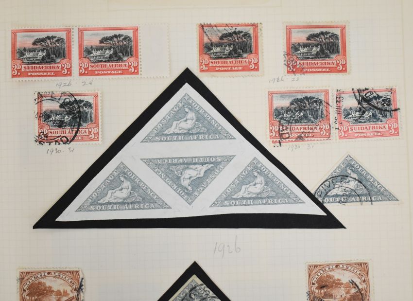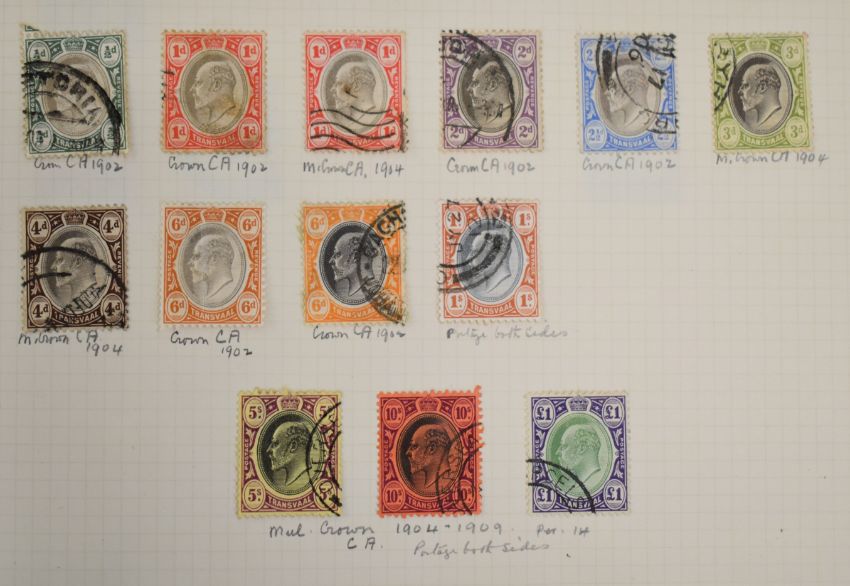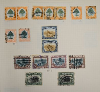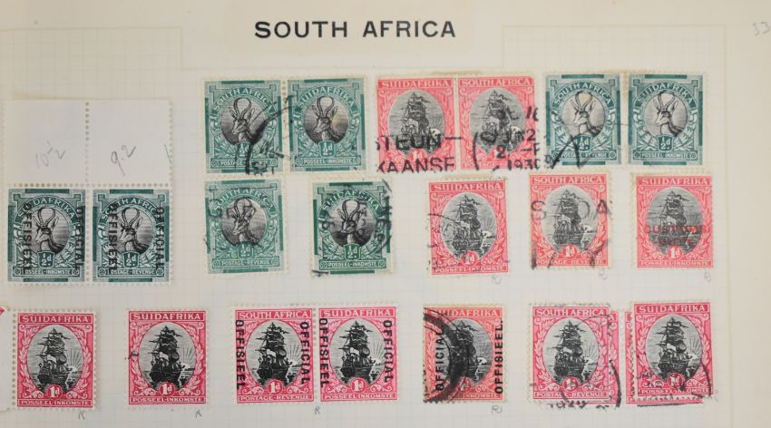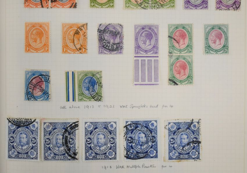 A collection of GB, Commonwealth and foreign stamps in three albums, on album pages and loose in envelopes. Commonwealth stamps with good ranges of Central and South Africa, one penny and 4d Cape Triangles, South Africa 1926 Hope Triangles in pair and block of four. King George V definitive issue to 10/- mint to 2/6 red selection of mint bilingual pairs to 4d and 6d official Transvaal King Edward VII to £1. Orange Free State values to 1/- with overprint varieties. Natal King Edward VII to £1 (perfin). GB 1840 1d black 3½ margin. King Edward VII to 5/-. 1918 Seahorses to 10/-. Rhodesia admirals to 5/- used (fiscal) 2/6 postally used. Southern Rhodesia King George V to 5/-. Good ranges of Canada, Australia and many of colonies, foreign with range of countries including Germany and Bavaria, many thousands loose in envelopes