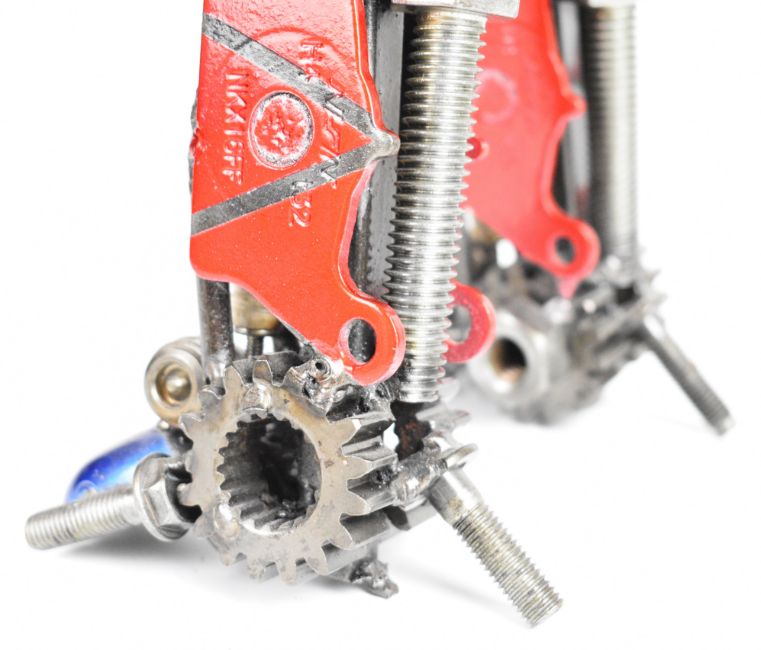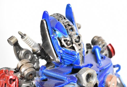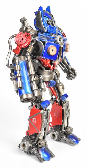 Transformers inspired recycled metal sculpture resembling Optimus Prime, height 34cm.