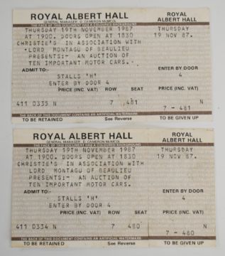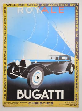 Christie's 1987 Bugatti Royale auction poster laid on board, advertising the auction held at the Royal Albert Hall, together with two tickets, poster size 70 x 51cm