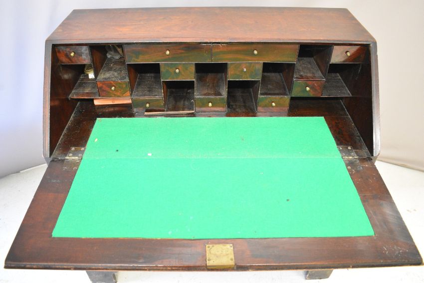 Georgian flame mahogany bureau, fitted four graduated long drawers, the main fall flap opening to reveal a series of drawers and pigeon holes, W110.5 x D57 x H106cm