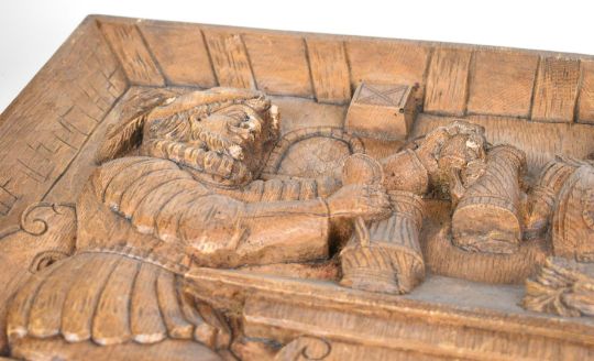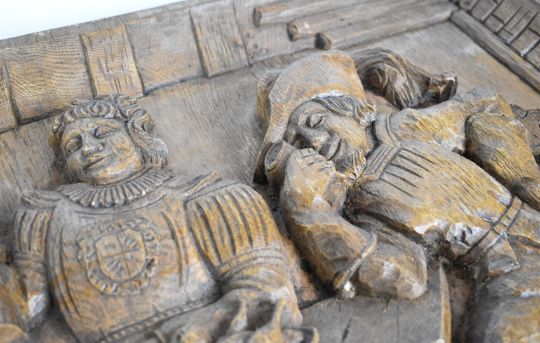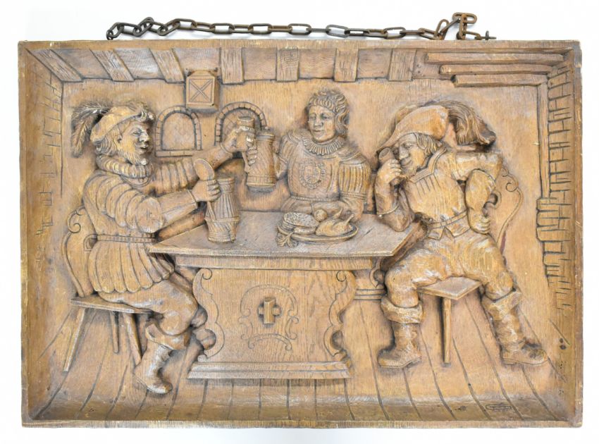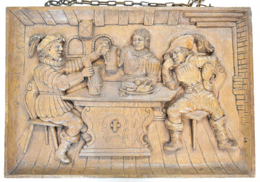 Large 19thC carved oak plaque with figural tavern scene decoration, W54 x H77cm