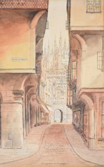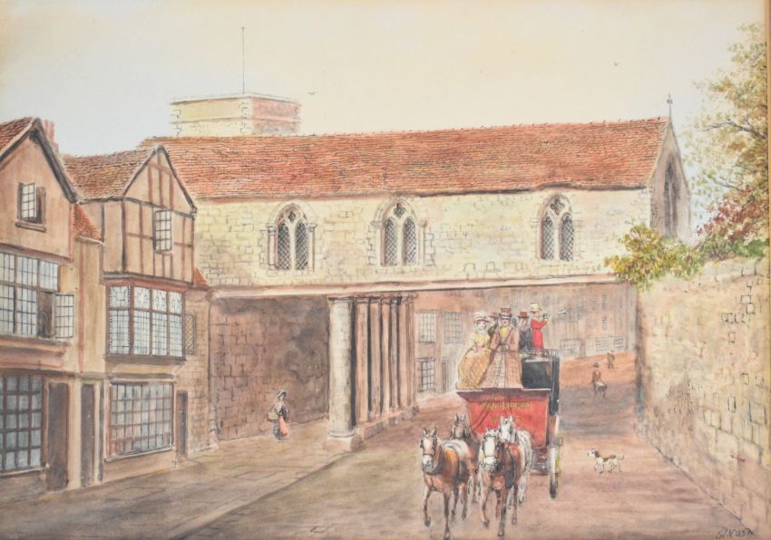 S.J. ‘Toby’ Nash (1891-1960) two ink and watercolours comprising Mercery Lane Canterbury (leading to gateway and Cathedral), 46 x 29cm, and a Canterbury horse drawn coach with passengers, 26 x 36cm, both signed bottom right and framed
