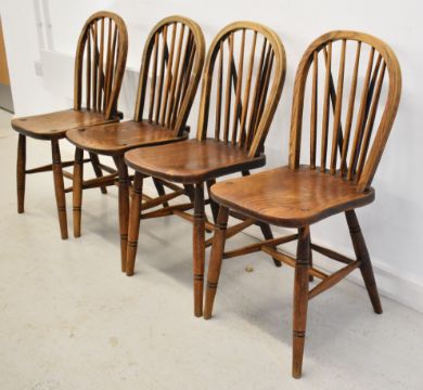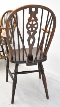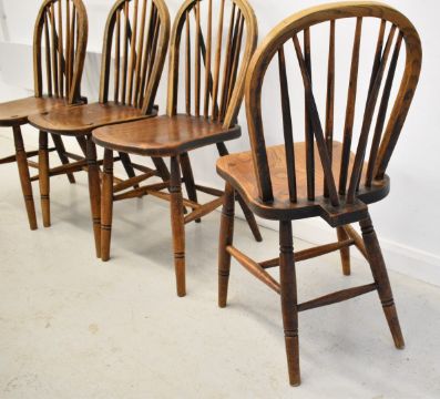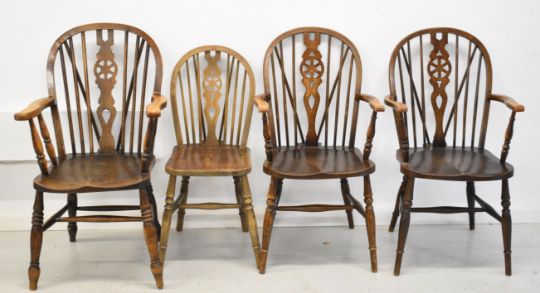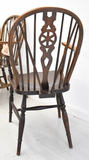 Eight elm seated chairs comprising four wheel back and four stick back examples