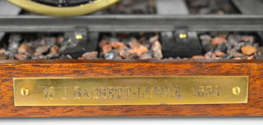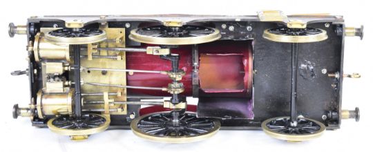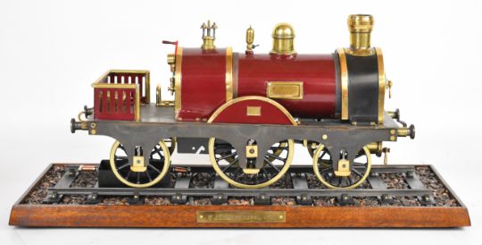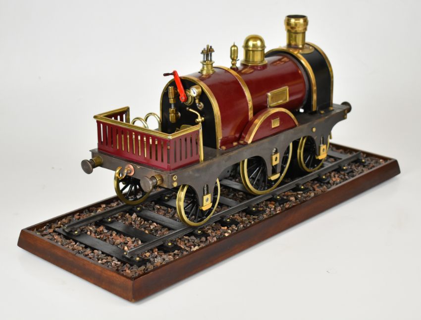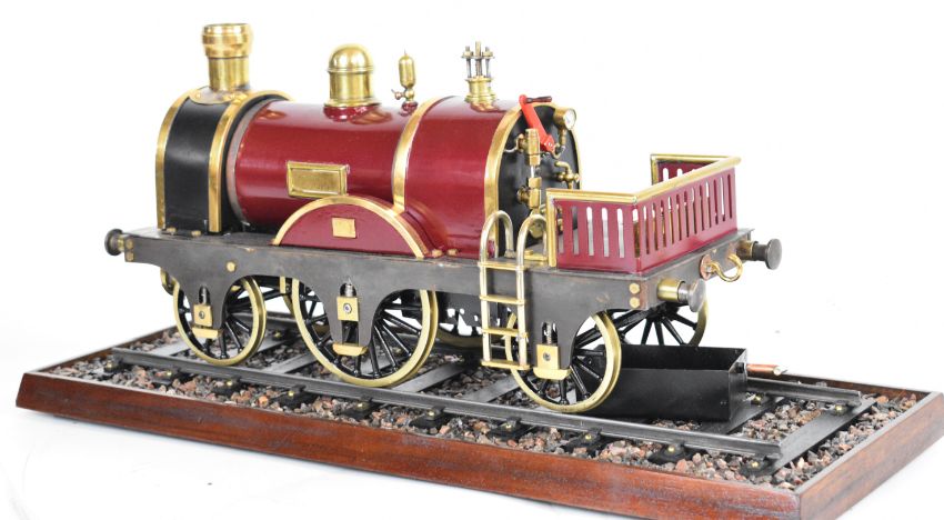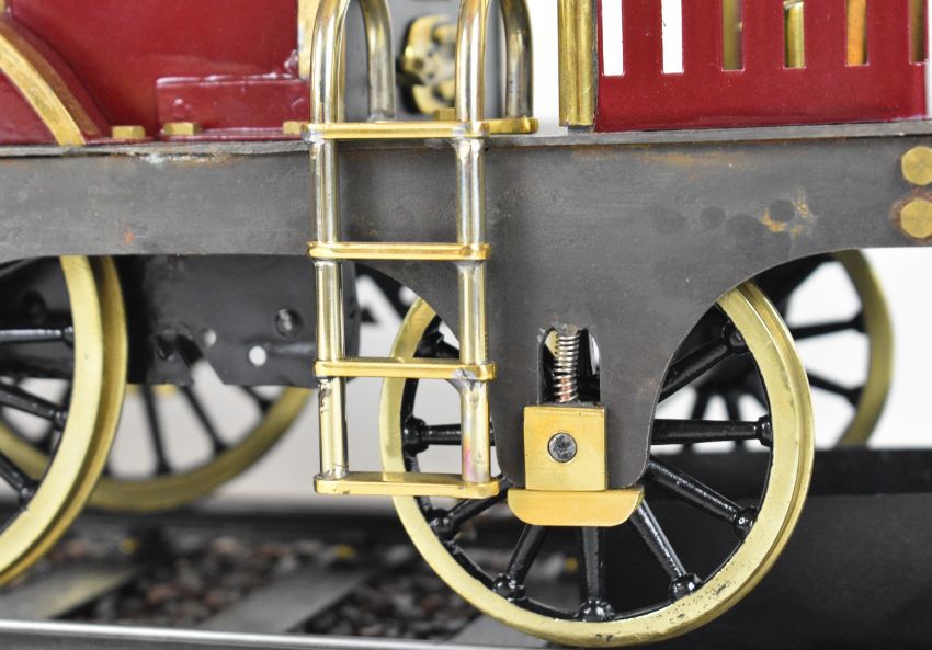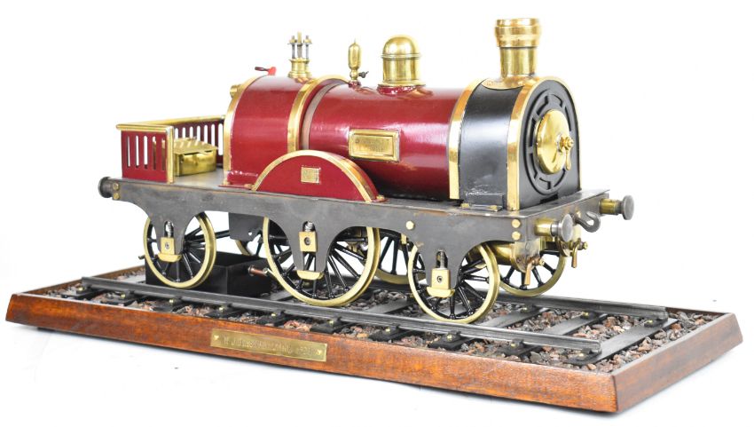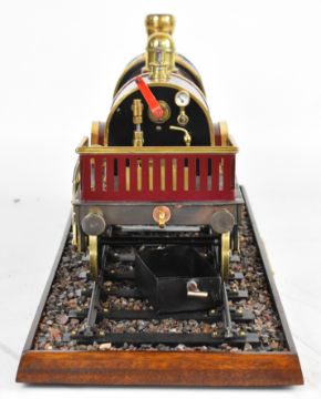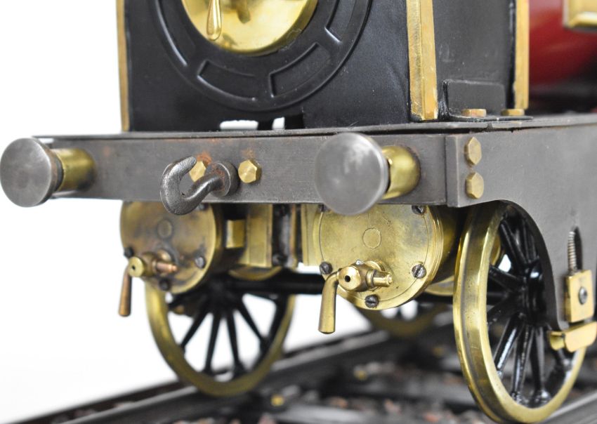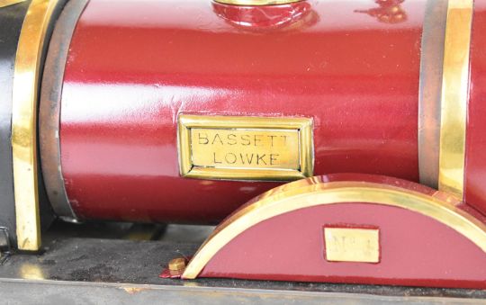 Victorian 4¼ inch gauge Dockyard style 2-2-2 live steam locomotive with brass spoked wheels, twin cylinders with knurled gland nuts and twin drain cocks. the copper boiler having water level gauge glass, 0-80 psi pressure gauge, safety valve and whistle, the boiler having Bassett Lowke name plates to side and No 1 to splashers, on display track with W.J. Bassett-Lowke 1899 to front, length of locomotive 43cm