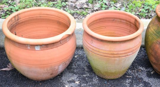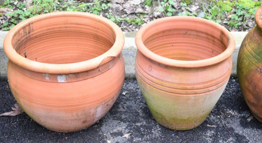 Seven terracotta jardinieres / garden planters of varying sizes, largest D50 x H46cm