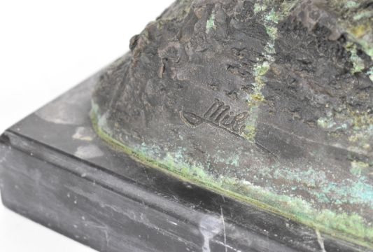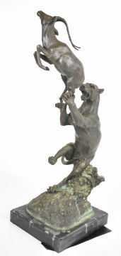 Bronze figure of a lioness capturing an antelope or gazelle in mid air, impressed signature 'Milo' to base, H58cm