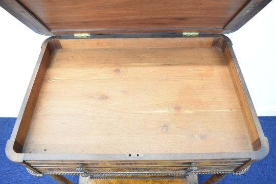 Late Georgian / William IV inlaid burr walnut or yew centre table, the fall flap lid with carved beaded decoration, with single drawer and dummy drawer to the front and two further dummy drawers verso, raised on four turned tapering legs united by a recessed undershelf, on lion pad feet, with label for Robert James Cabinet Maker & Upholsterer, 35 Broad Mead, Bristol 'manufacturer of British Woods to his Majesty' to inside of lid, W77 x D53 x H78cm