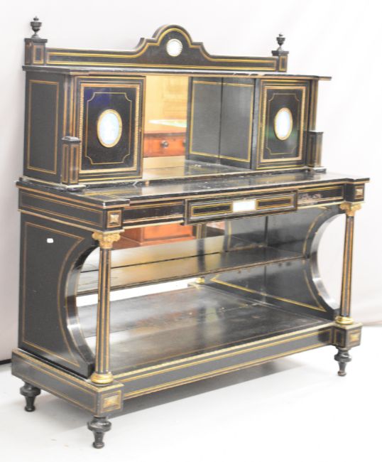 Victorian ebonised and brass inlaid mahogany breakfront side cabinet with ormolu mounts, inset Wedgwood Jasperware plaques, mirror back, twin fitted cupboards, single drawer, reeded tapering supports and undershelf, raised on turned feet, W122 x D46 x H126cm