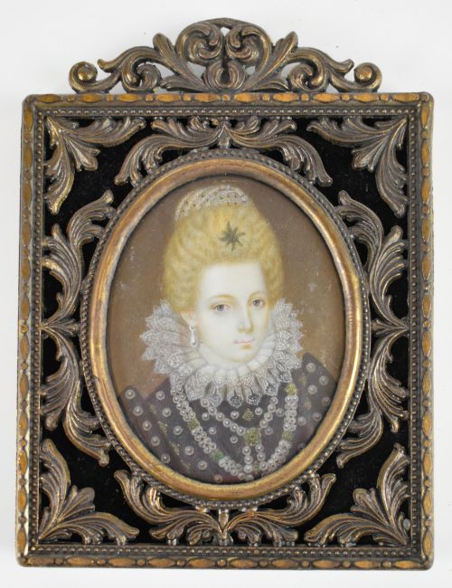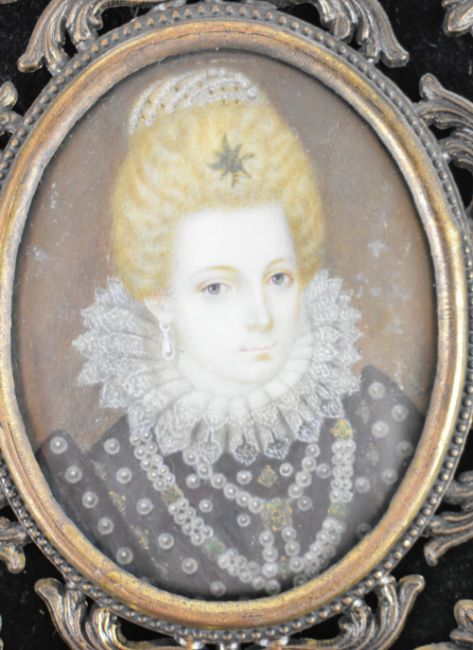 19th century portrait miniature on ivory of a lady in lace ruff with pearl or similar necklace, indistinctly signed possibly E Maleh to right hand side, maximum diameter 8.5cm, in gilt frame, with ivory licence