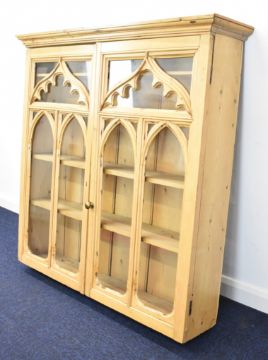 19thC glazed pine display cabinet with hanging fixings verso, W113 x D26 x H111cm