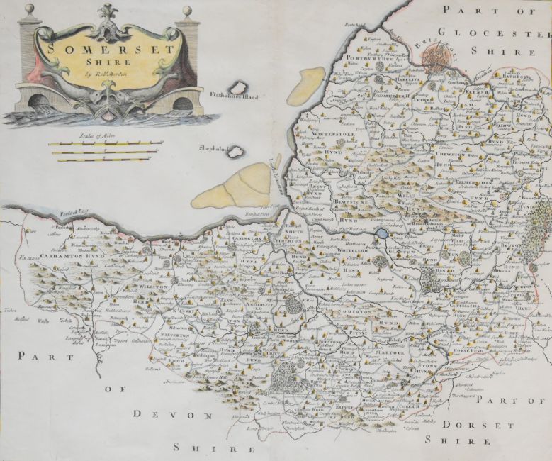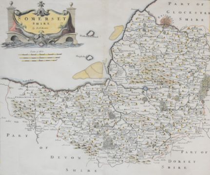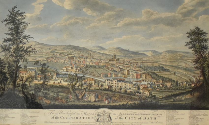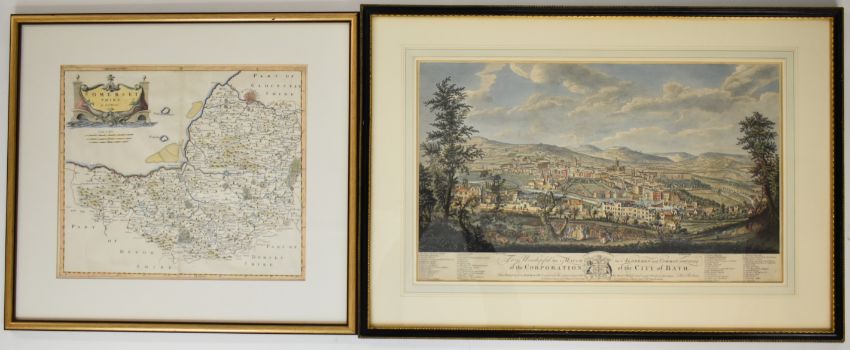 T Robins hand coloured etching 'The Prospect from Beechencliff' of the city of Bath, published 1757 by Mr Sperias, 36 x 61 cm, in part gilt frame together with a Robert Mordan map of Somerset, 36 x 42.5cm in gilt frame