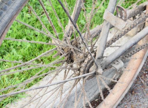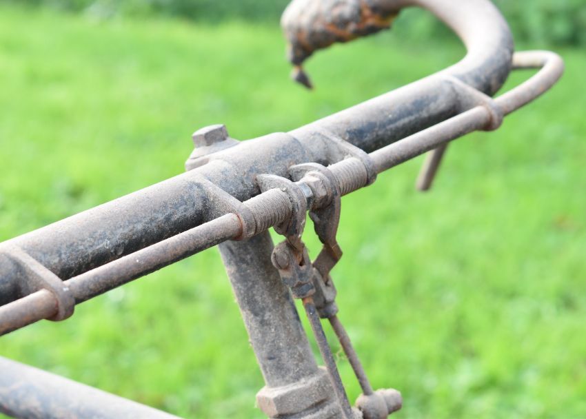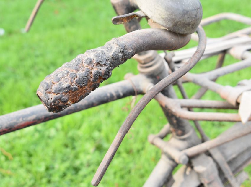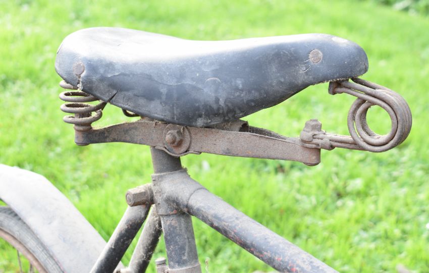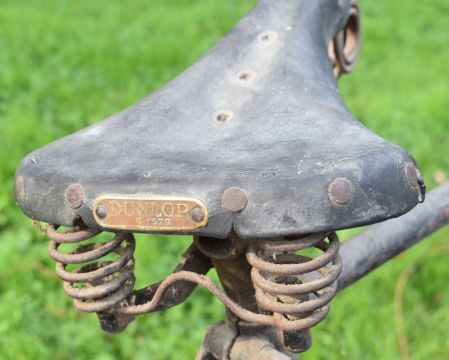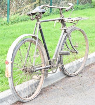 Vintage tradesman's bicycle, likely pre war, with rod brakes, bell, bolt on steel front rack and Dunlop saddle