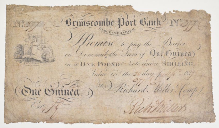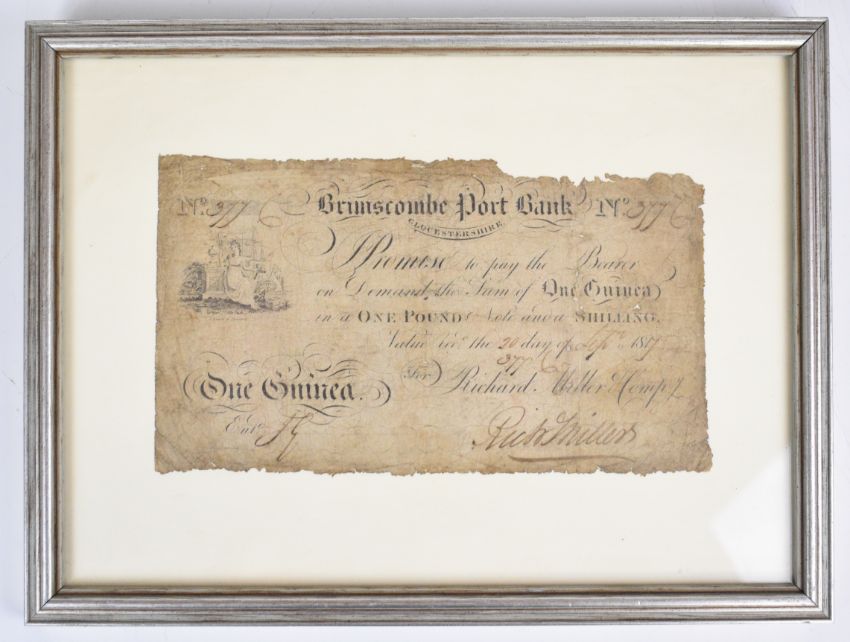 [Local Interest] Brimscombe Port Bank, Gloucestershire for Richard Miller Company One Guinea certificate, dated 20th September 1817, serial number 377, measures 11.5 x 20cm in frame