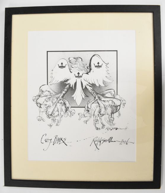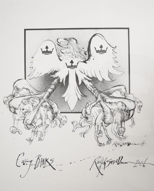 Ralph Steadman ‘Caring Banks’ satirical print featuring Barclays logo, signed and dated by the artist lower right, 55 x 45cm framed