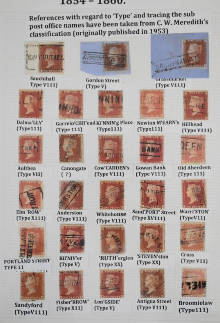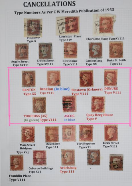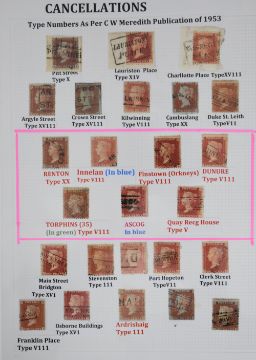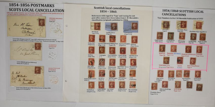 1d red stamps with Scots local cancellations collection on three album pages, various local Scots cancellations including three covers