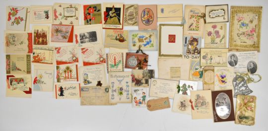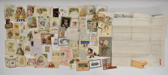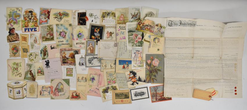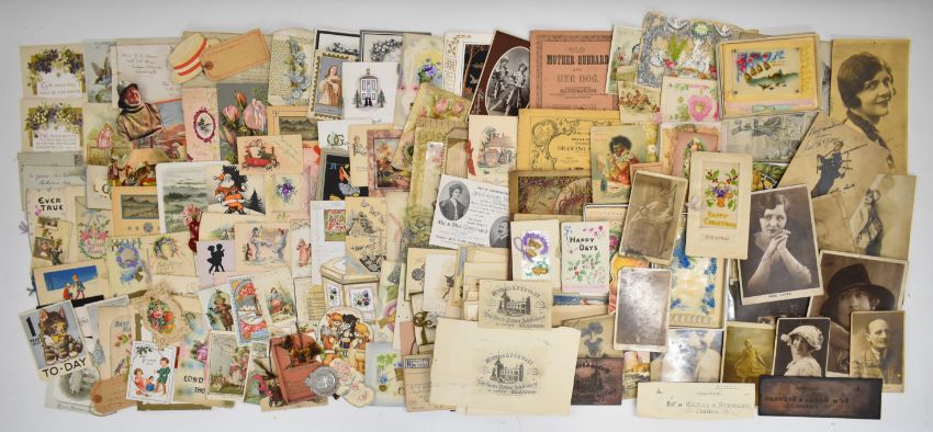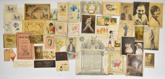 Collection of Edwardian and later vintage cards and ephemera including greeting and celebration cards, hand-drawn, appliqué, embroidered and silk cards. Old Mother Hubbard wrapper bound book with illustrations printed in colour published J.T. Wood. Victorian illustrated book of verse. William Hermes drawing school copy book. St. Leonards Grand Bazaar Coral Cave and Submarine market 1895. Master Mason certificate issued by the Grand Lodge of Scotland 1877 on vellum sheet. Metal printing plates for illustrated letterheads of Munro & Stewart Clothiers of Glasgow with printed examples, together with a group of 1930s/40s signed photos and postcards of stage & theatre performers