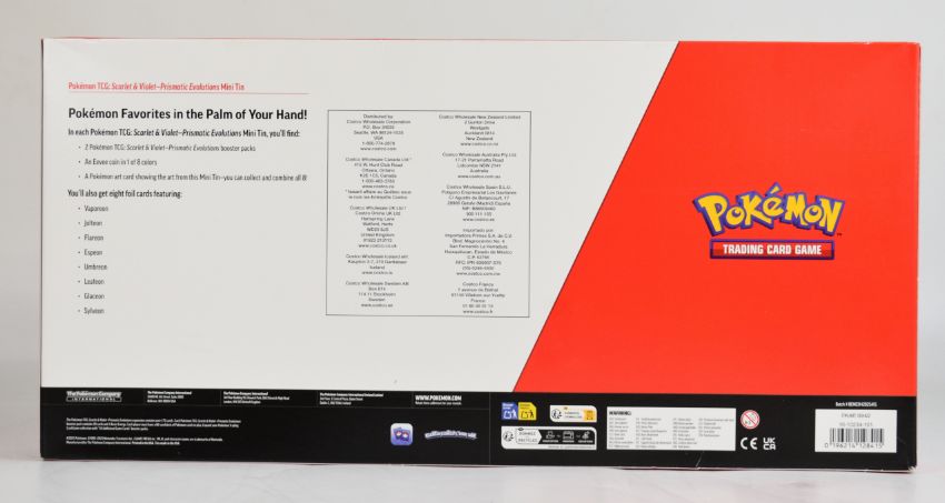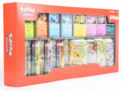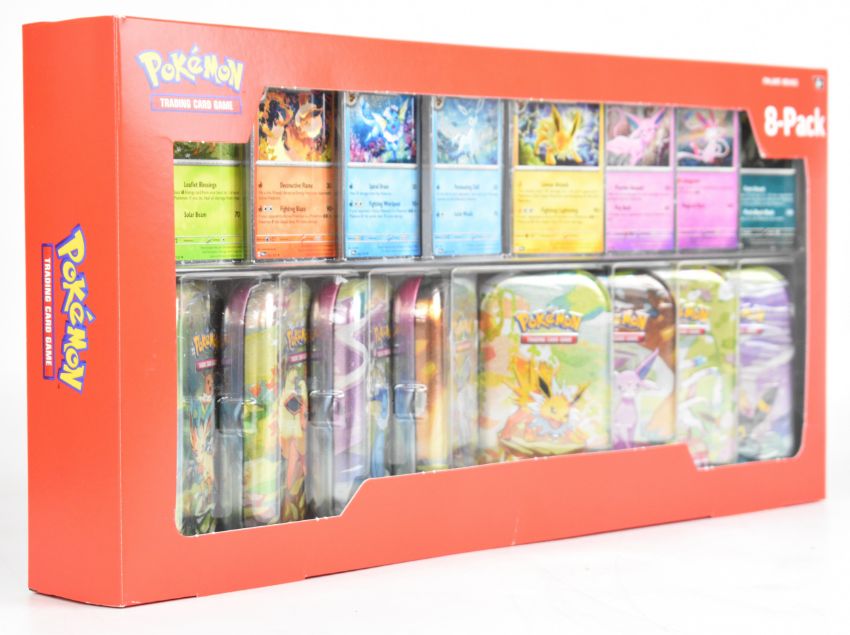 Pokémon TCG - Scarlet & Violet 'Prismatic Evolutions' mini tin 8-pack, each containing two boosters, Eevee coin and art card, together with eight foil promos, sealed.