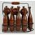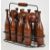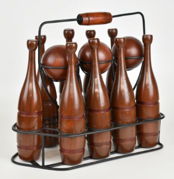 Turned wood lawn skittles set, housed in a metal carrier, height 31cm.