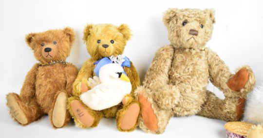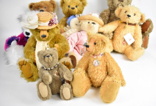 Nine Robin Rive and similar artist Teddy bears, the majority with original tags, tallest 53cm.