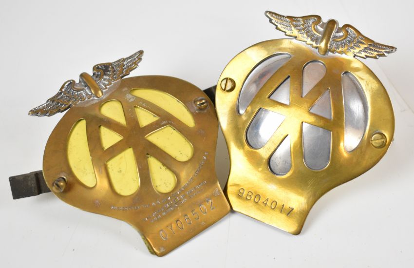 Vintage, pre-war and classic car accessories and parts comprising racing fuel cap to suit circa 2¾ inch filler neck, French mirror, Art Deco style sidelights, goggles, pair of Barnacle ashtrays and two AA badges