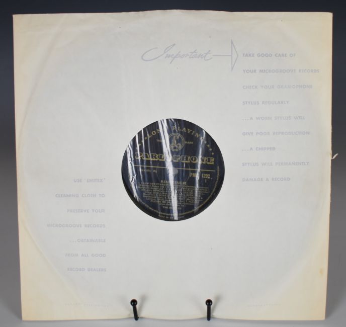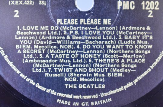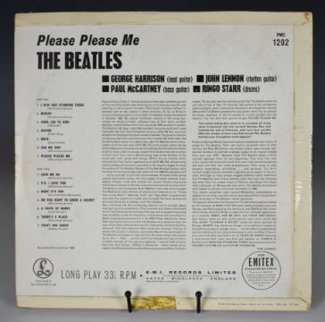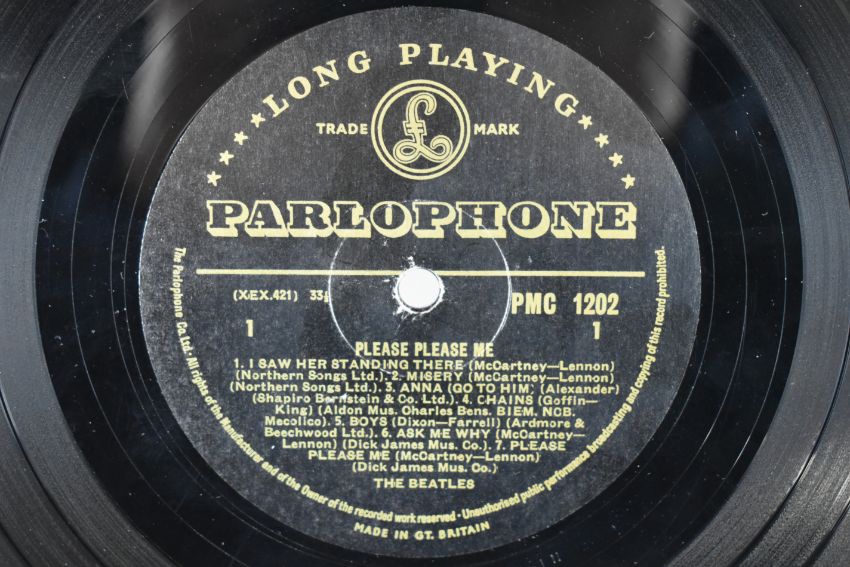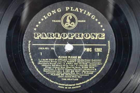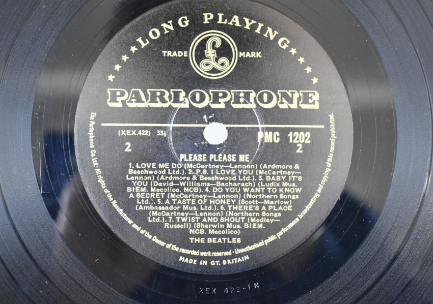 The Beatles Please Please Me LP (PMC 1202) with black and gold label, second mono UK press with Northern Songs credits on A1, A2, B4 & B6 and Dick James credits on A6 & A7. MT tax code. Ernest J Day cover with right justified Angus McBean photo credit. Emitex liner. Matrix / runout stamped A side runout XEX 421-1N, B side runout XEX 422-1N. Rare clean example, vinyl appears VG+ to Ex in the main, labels clean.
