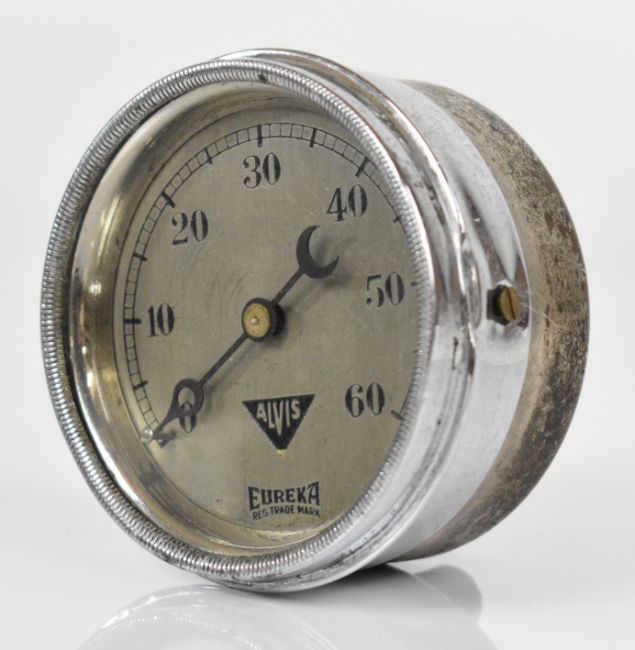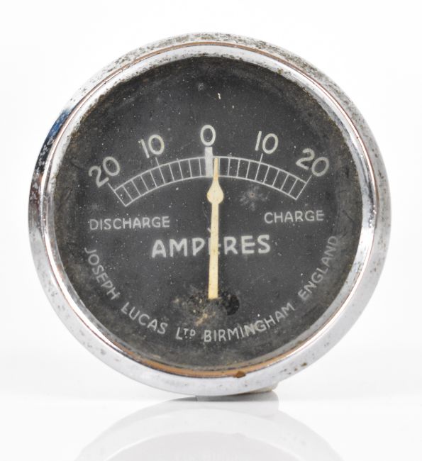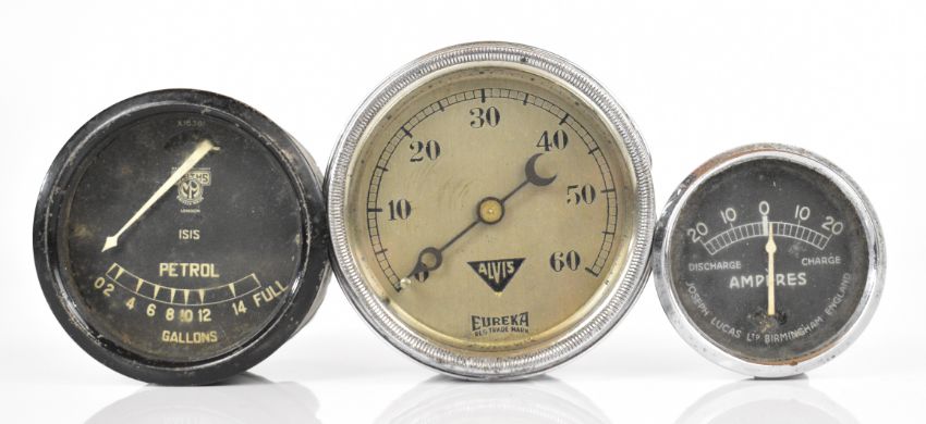 Alvis Eureka 0-60psi vintage or pre-war car oil pressure gauge, Smiths petrol gauge and a Lucas CZ 13 ammeter