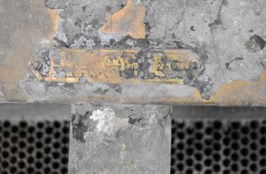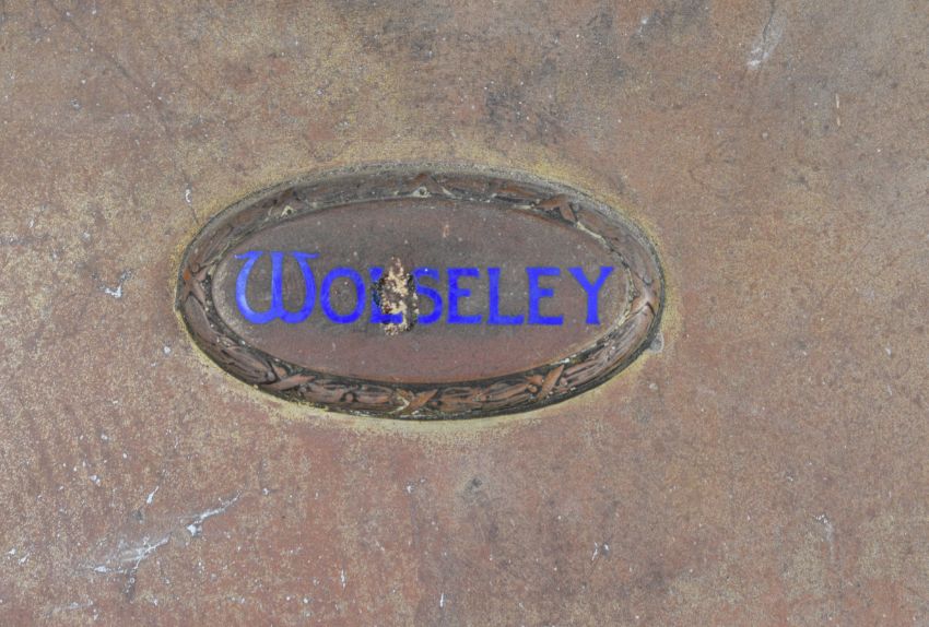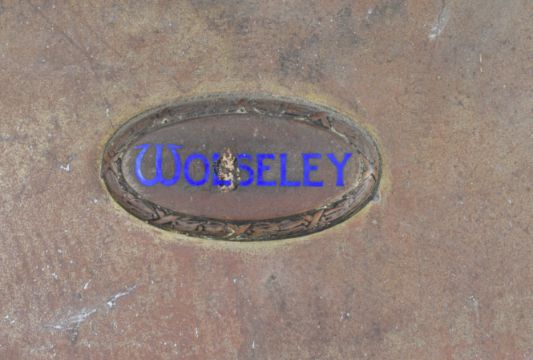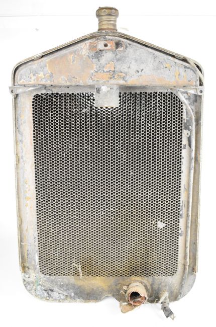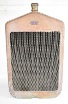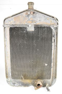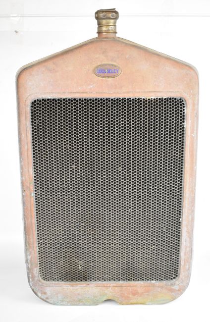 Believed 1929 Wolseley vintage car radiator and cap, with blue enamel badge to front, overall size 85 x 52 x 24cm