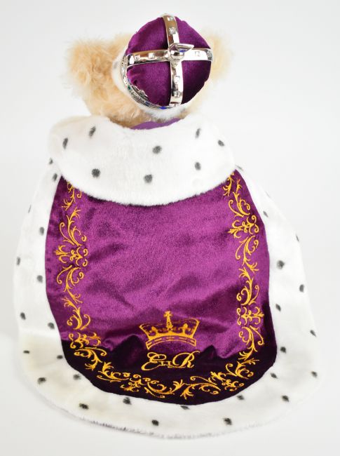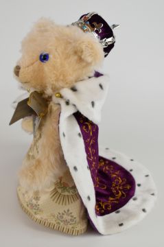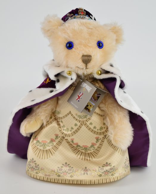 Merrythought 'Celebration of a Reign' Queen Elizabeth II Teddy bear with blonde mohair, blue eyes, stitched features, robe and crown, limited edition 531 of 1953, with original tags, HMQ12QCMBI, height 30cm.