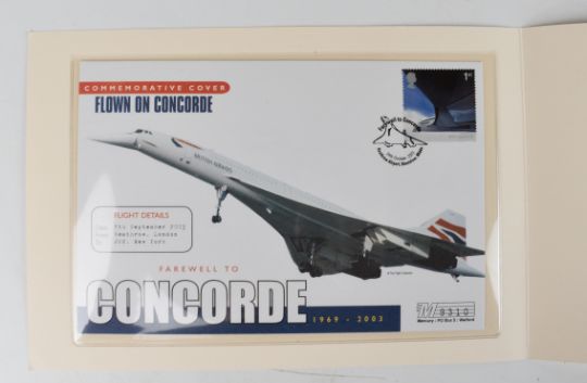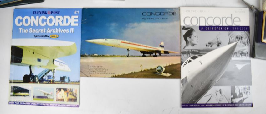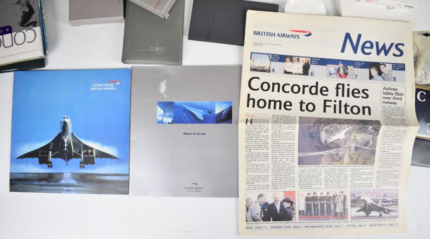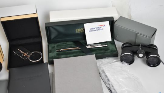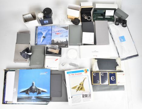 Concorde promotional and commemorative items to include blank flight certificates in wallet, various branded books and organisers, Westminster coin cover, playing cards, keyring, London and New York clock, further clock, model, Tupolev Tu-144 pin badge and other material