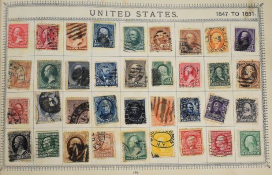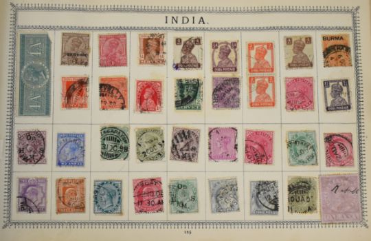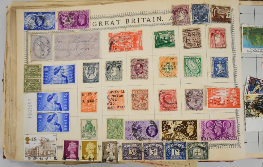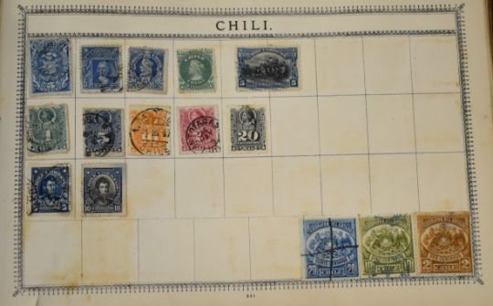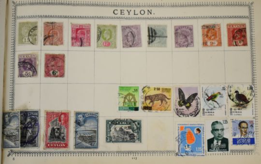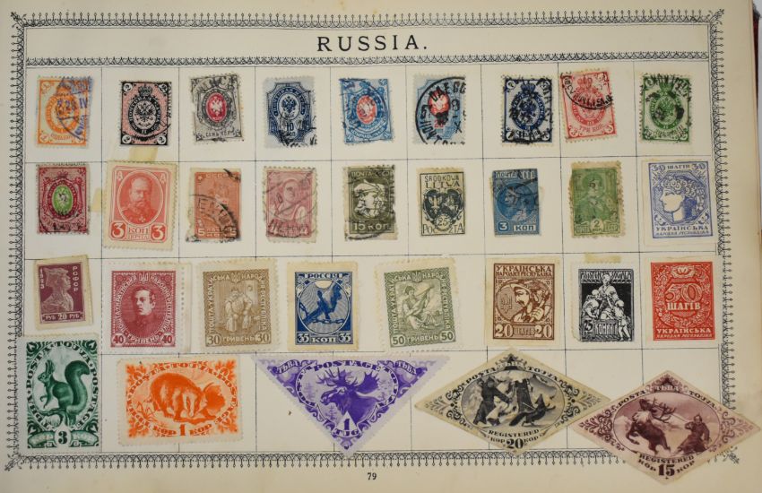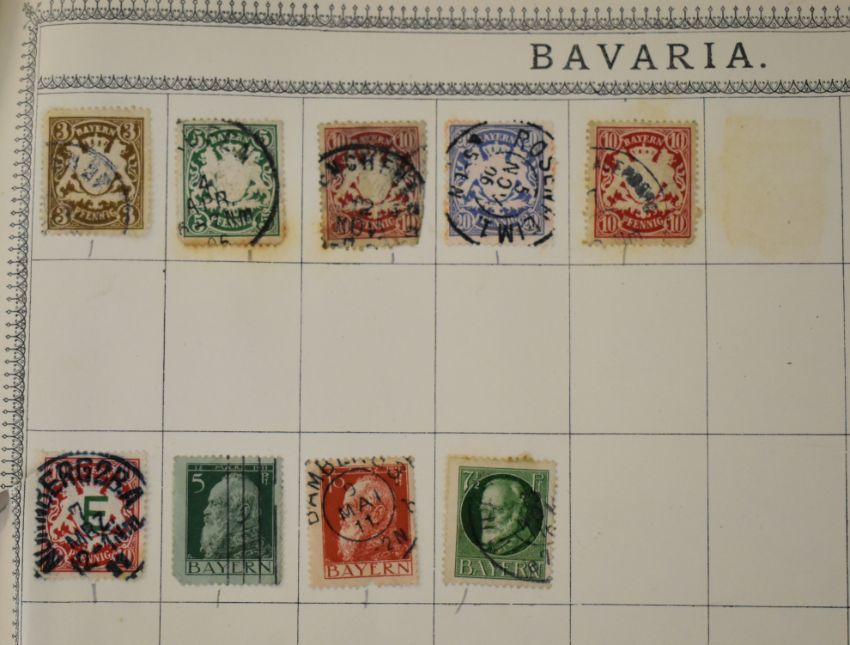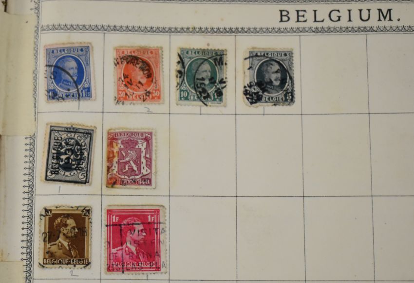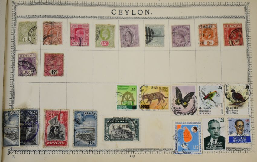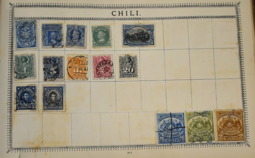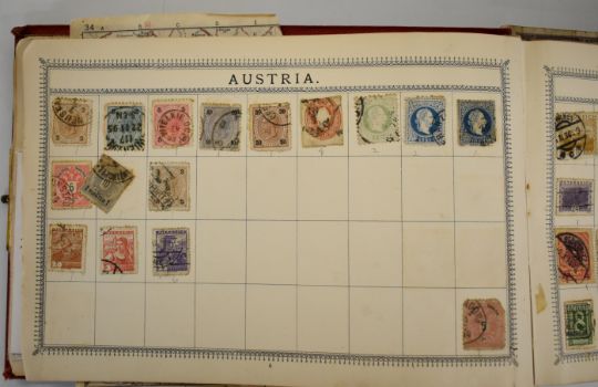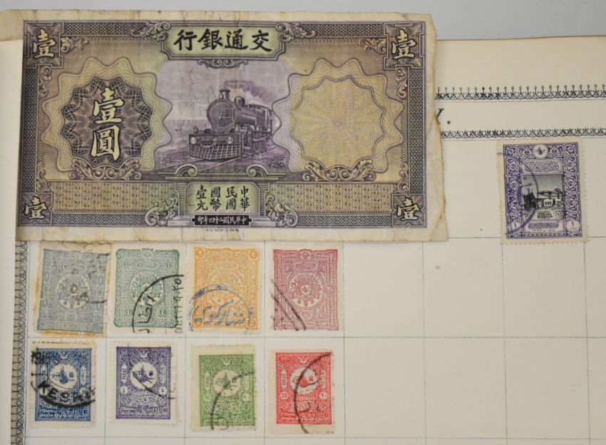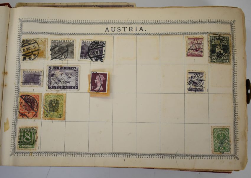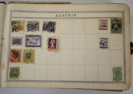 Small all world stamp collection in early 20thC stamp album, countries include China, Hong Kong, Canada, French Colonies, Australia, Switzerland and Spain