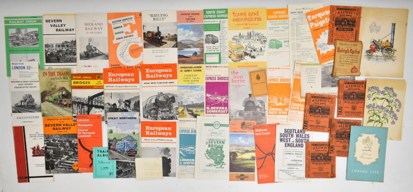 [Travel & Transport] Collection of vintage brochures, magazines, leaflets, books and guides, mostly train and railway including Great Northern, The Iron Horse, Talyllyn Railway, Severn Valley, Midland, European Railways, Snowdon Mountain Railway, Vale of Rheidol, Railway Bridges, Trains Album, Railway Forum, Freight and Mixed Traffic Locomotives, P&O souvenir menu 1950, Canadian Pacific Empress of Canada menu, Cycling Coronation Number 1937, Cycling Earls Court Show number 1938, The Motor Magazine for March 1932, Postans and Morley Brothers 30 shades of the finest coach colours (with examples) together with bus and coach timetables and leaflets and a quantity of tram and bus tickets etc