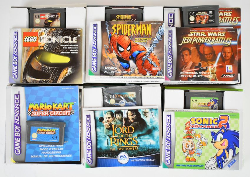 Six Nintendo Game Boy Advance retro computer games comprising Lego Bionicle, Spider-Man Mysterio's Menace, Star Wars jedi Power Battles, Mario Kart Super Circuit, Lord of the Rings: The Two Towers and Sonic Advance 2, boxed with instruction manuals.