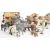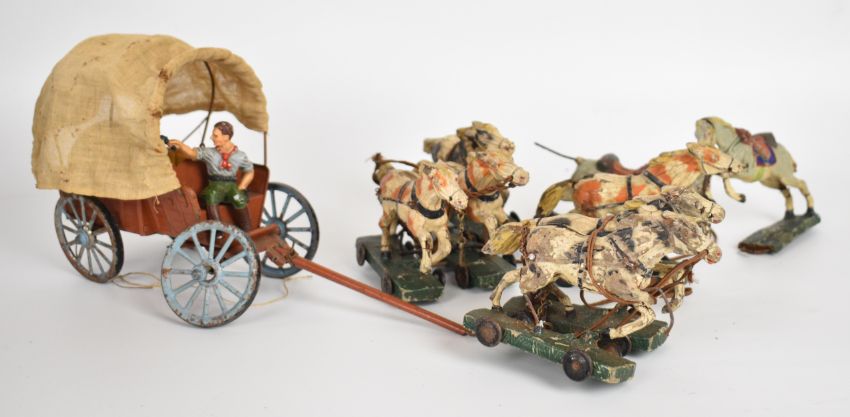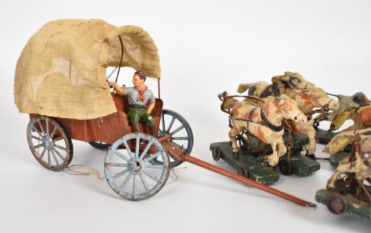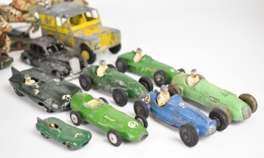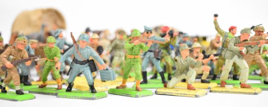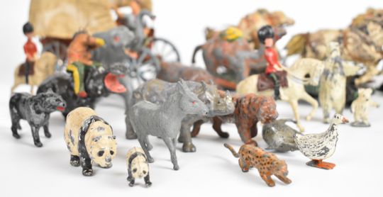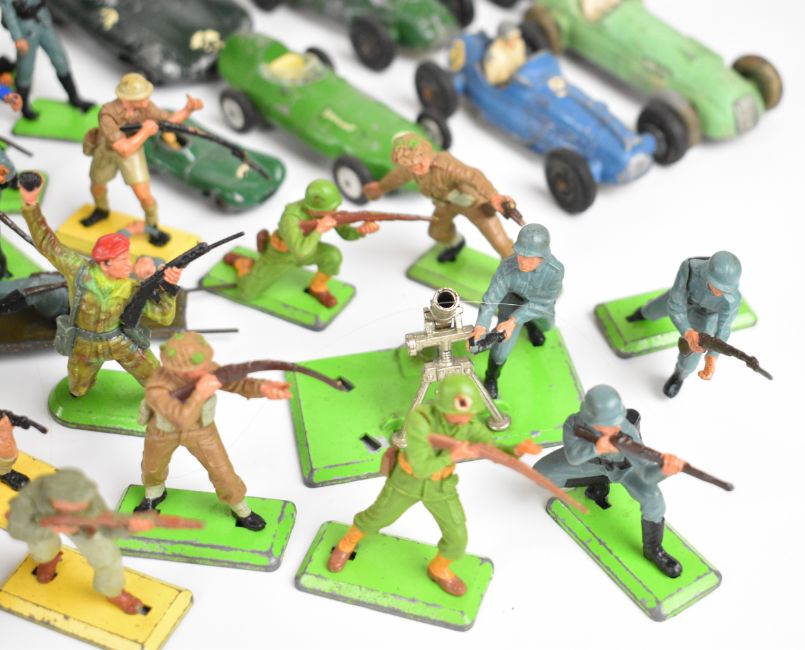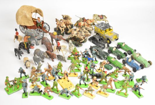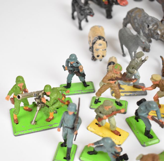 A collection of Britains and similar cowboys and toy soldiers, together with a small group of animals and play worn Dinky.