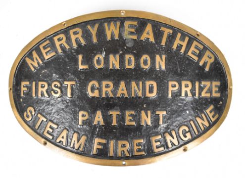 Merryweather steam fire engine curved brass or bronze maker's plate, length 25cm