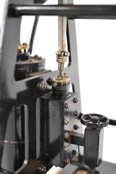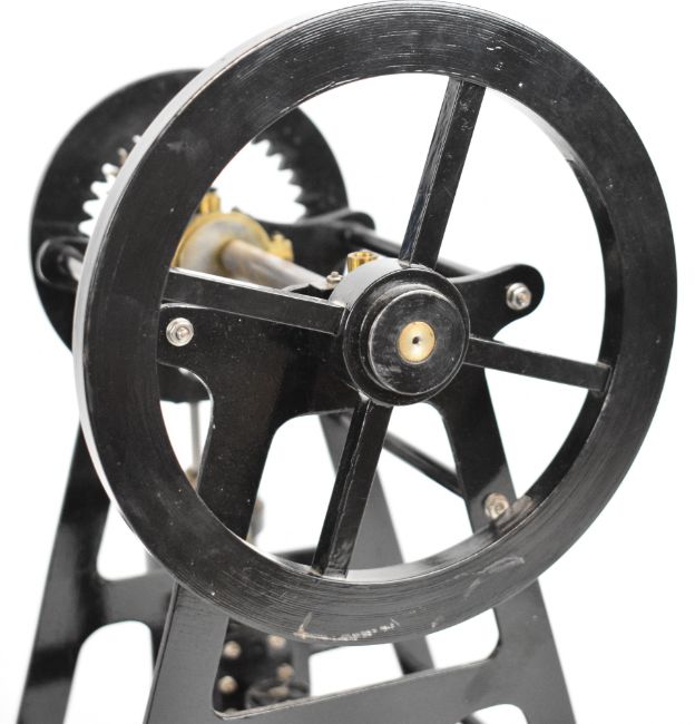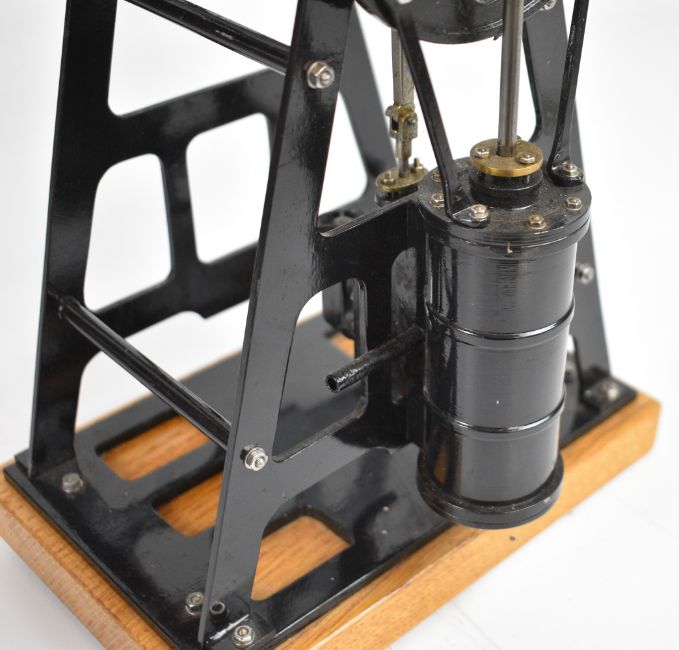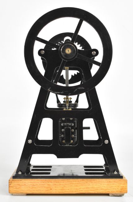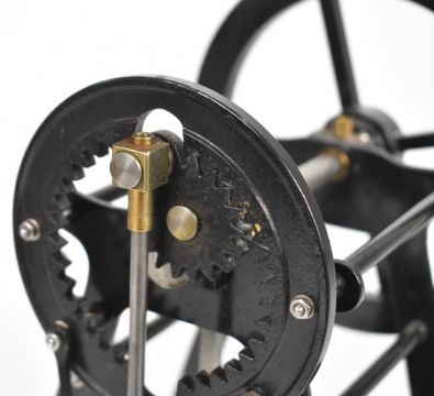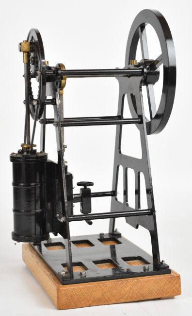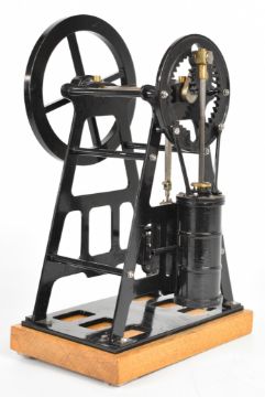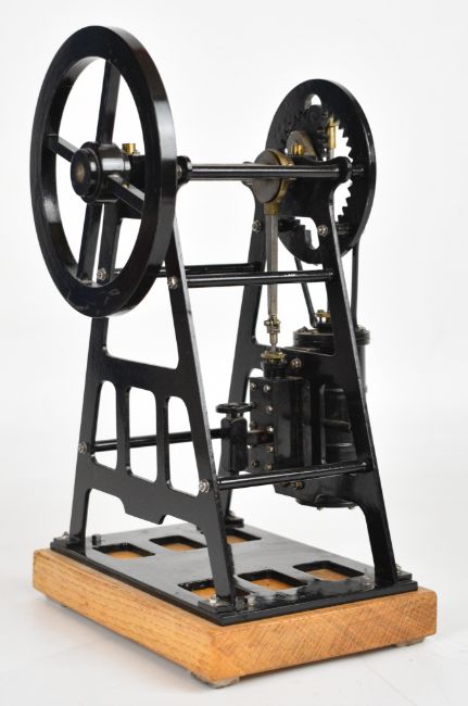 Murray's hypocycloidal live steam stationary engine with planetary gear crank, eccentric driven slide valve and A shaped frame, the main and big end bearings having brass oil cups and the engine driving a 16cm flywheel, on oak base, overall height 34cm