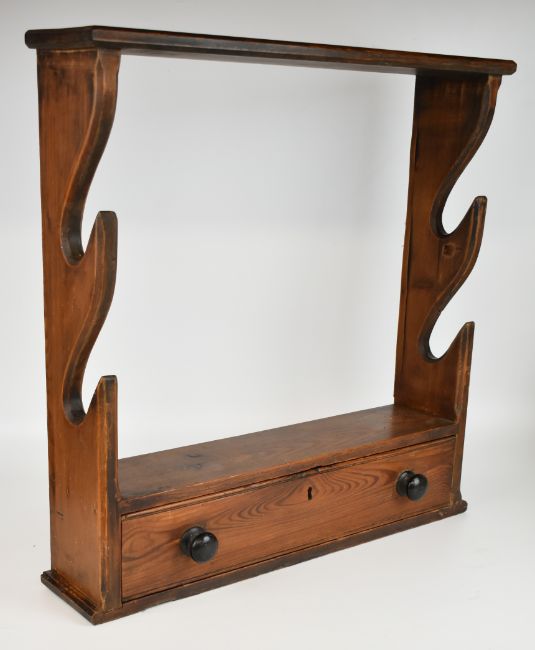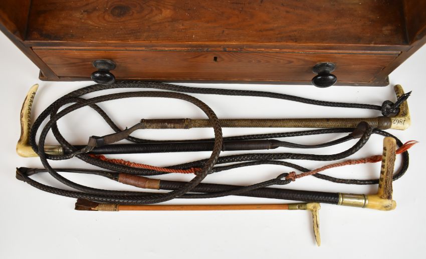 19th/20thC pine whip / stick stand with single drawer with four whips / crops, one engraved 1862, W66 x D18 x H60cm