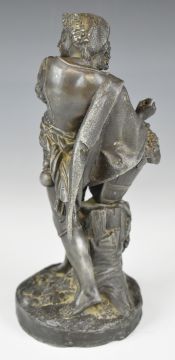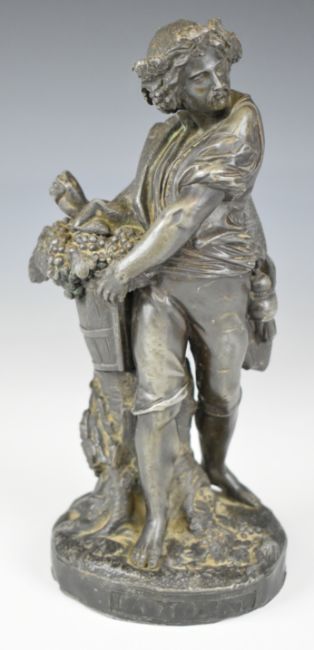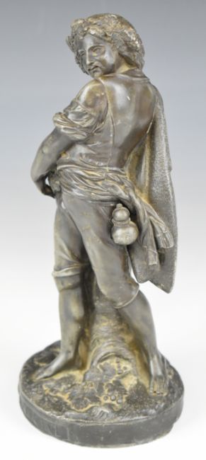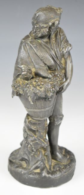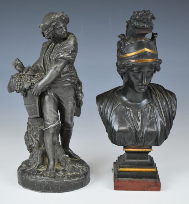 Neoclassical bronze bust impressed 'Roma' to rear of base, and a spelter figure of a grape harvester, tallest 25cm