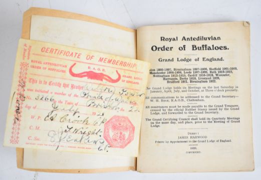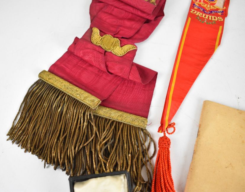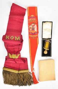 A 9ct gold hallmarked RAOB ‘Founder’ jewel from Ye Old Tudor Lodge 5673 with engraved presentation on reverse dated 1926, in padded case (5.66g), RAOB silk moiré sash embroidered in gold thread ‘KOM’ (Knight of Merit) with buffalo horns and gold fringe, RAOB Handbook dated 1920 and a membership certificate 1921, together with a woven silk ceremonial sash from the United Ancient Order of Druids